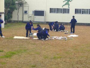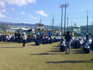 1月19日(月)に第3回避難訓練を行いました。前回に引き続き、今回も生徒だけでなく、先生方にも予告せず、さらに自由時間である昼休みに行いました。体育館で応援練習をやっている生徒、中庭でアルミ缶タワーに参加している生徒、グラウンドでサッカーをしている生徒、教室で友達と談笑している生徒など、自由に過ごしている時間に緊急地震速報が流れ、身の安全を確保した後、グラウンドに避難しました。さらに、学年で1人避難していない生徒を設定し、点呼の必要性を実感させる訓練にもしました。校長先生からは、「今回の訓練は、現実に近い形となった。先生が近くにいない。誰がどこにいるかわからない。そういう中で、自分の身を守るためにどうすればよいかを考える必要があった。準備しているときに地震はこない。非常時にはSNSのデマを信じず、正しい情報を得ることも必要だ。いざというときに想像力を膨らませてほしい。」という話がありました。