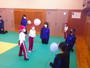 3年生は家庭科で保育について学習しています。前回は間宮幼稚園に行きましたが、今回は園児が中学校に来て交流しました。生徒は、園児が楽しめる遊びは何かをクラスごと考え、準備してきました。当日は、中学生も園児も楽しそうに遊んでいました。