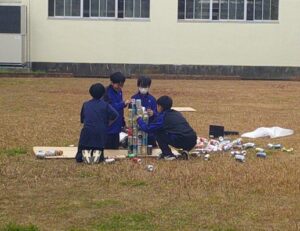 中庭を活用するために、生徒会執行部が「アルミ缶タワー」を企画し、昼休みに行いました。4人ひと組でグループを組み、30秒間でどれだけアルミ缶を積み重ねられるかを競いました。ベランダからも応援する声が聞こえました。