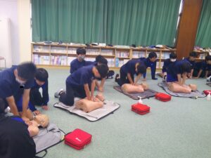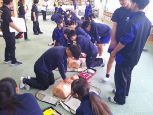 2年生は、9月30日(火)、10月1日(水)の2日間、保健体育の授業で救命講習に取り組みました。駿東伊豆消防本部救急ワークステーションの方から、心肺蘇生の手順や心臓マッサージ、AEDの使い方を学びました。生徒は、模型を使って実際に体験したことで、いざというときのために役立つ知識を得ることができました。