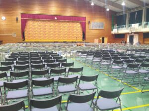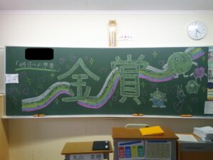 ついに、蒼龍祭「文化の部」前日となりました。帰りの会の合唱では、どこのクラスからも気持ちの入った歌声が響いていました。その後の会場づくりでは、生徒会執行部が全校生徒に指示を出し、いす並べを行いました。蒼龍祭実行委員は、保護者用のいす並べや審査員席を設置したりと、一生懸命活動していました。会場が整ったあと、生徒会執行部がリハーサルを念入りにしていました。教室の黒板には熱いメッセージがあるクラス、担任の先生が熱いメッセージ送っているクラスなどがありました。