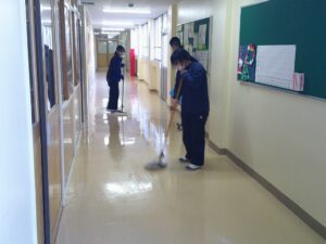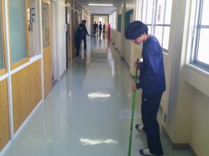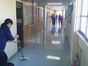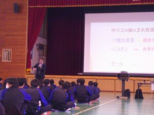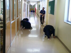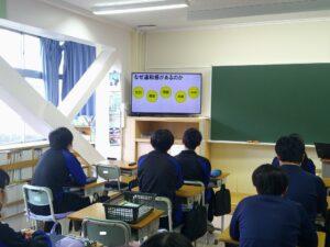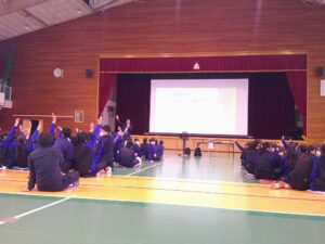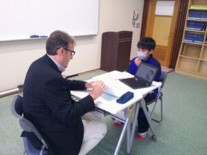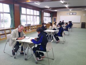 12月3日(水)1年生の英語の授業では、本校のALTの先生に加え、外部から派遣されたALT5名の先生方が来校し、パフォーマンステスト(話す力を測るテスト)を行いました。生徒は、ALTの先生と1対1になり、自己紹介をした後、自分が好きなもの(キャラクターや音楽など)を説明しました。そして、「スポーツはできる?」「ライスとパンどっちが好き?」「好きな歌手は?」といった質問に英語で答えました。最後にフリートークで生徒が質問をしました。中学生になってから初めて1対1で会話するとあって、最初は緊張し不安いっぱいだった生徒も、自分の英語が通じたり、英語を聞き取れたりしたことで笑顔で対話している生徒が多かったです。一方で、終わった直後に残念がっている生徒もおり、もっと英語を勉強してコミュニケーションをとりたいと、学習意欲が増している生徒もいました。