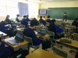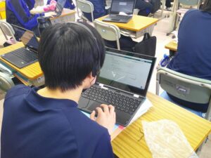 来年度の4月23日(木)に全国の中学3年生を対象に、全国学力学習状況調査が行われます。国語・数学に加え、英語(話すこと、書くこと)の調査を行います。英語はクロームブックを用いて問題の表示・解答を行うため、その事前準備として、事前検証問題を用いて問題を見たり、録音等が正常にできるかを確認しました。うまく録音されない等のトラブルがありましたが、担任の先生が個々に対応し、2年生全員確認することができました。
