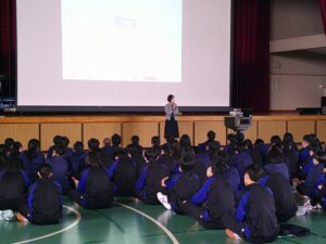 そのとき、2年生では1年後に向けて、進路について説明をしていました。3年生になってからの日程や出欠席や成績について、そして高校見学を通して「自分の進路は自分自身で決めること」について話があり、生徒は自分ごととして聞いていました。