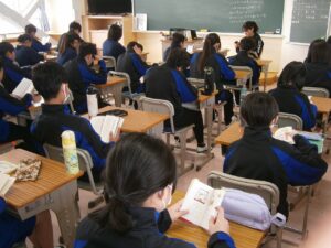 毎朝、読書に親しむ時間を設けています。静かに本と向き合っていました。先生も一緒に読書しています。