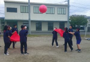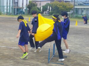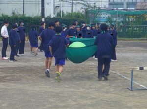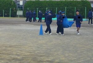 縦割り種目③「バランスキャッチ」 投稿日時: 2025年10月14日 投稿者: user 「バランスキャッチ」は今年度新しくできた種目です。4人ひと組で長方形の布を持ってボールを運びます。ハードルを越え、コーンを回ってから、次のグループにボールを投げてパスします。それを繰り返すという種目です。なかなか難しく、苦戦しています。
