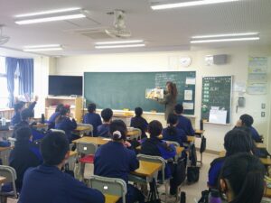 3年生の総合的な学習の時間では、函南町のリソース(ヒト、モノ、コトなど)をもとに、よりよい函南町にするための提言を考えてきました。生徒それぞれが企画したものをクラスで発表し、クラスで選ばれた代表が11月5日(水)に学年で発表しました。「オーダーメイド体験ツアーを企画し、町外の人が体験したいことや観光したいところへ行き、函南町のよさを知ってもらうことで、空き家を活用し移住者を増やす」「災害時の非常食は乾燥したものが多い。そこで函南町のいちごを使ったいちご羊羹を非常食に活用することで、スイーツとしてもいいし、糖分も取れる」「函南町はゴミが多く、その中でも古紙が多い。そこでリサイクルステーションを設置し、リサイクルするともらえるポイントで函南町の特産品がもらえ、それをSNSで情報発信することでより知名度が上がる」「函南町のゴミを減らすために、公園の少ない函南町にスポーツパークをつくり、ゴミをリサイクルした資源を床に活用する。そのスポーツパークでモルック等のニュースポーツを実施したり、被災場所にも活用できる」というアイディアを発表しました。聞きに来た函南町学校教育課、上下水道課、福祉課、産業振興課、企画財政課の担当者は、「どの発表も函南町の課題をよく捉えたものだった」「データ収集が細かく、資料がすばらしかった」「アイディアがよく、参考になった」という言葉をいただきました。自分が住む函南町をよりよくするための企画を考えたことが社会参画につながり、社会に出たときに他者に説明するプレゼン力も身についたと思います。