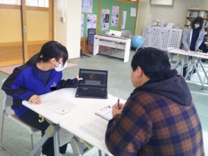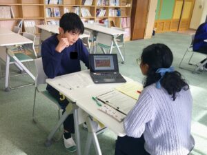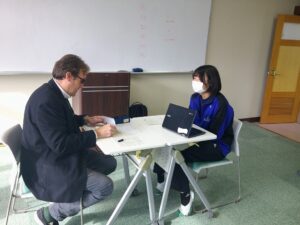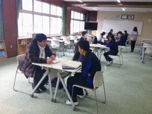 11月6日(木)3年生の英語の授業では、本校のALTの先生に加え、外部から派遣されたALT5名の先生方が来校し、パフォーマンステスト(話す力を測るテスト)を行いました。生徒は、ALTの先生と1対1になり、自己紹介をした後、ALTの先生が「日本のお菓子好き?」「人気のお菓子は何?いくら?どこで買える?」という質問に、生徒は英語で答えました。その後、自分が好きなお菓子を英語で紹介しました。6月のパフォーマンステストに比べて、聞き取る力がつき、スラスラと英語で会話する生徒が増えました。また、自分が言いたいことが伝わったことで自信がついているようでした。