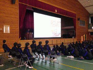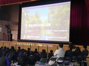 3年生の総合的な学習の時間では、函南町のリソース(ヒト、モノ、コトなど)をもとに、よりよい函南町にするための提言を考えてきました。生徒それぞれが企画したものをクラスで発表し、クラスで選ばれた代表が11月5日(水)に学年で発表しました。「オーダーメイド体験ツアーを企画し、町外の人が体験したいことや観光したいところへ行き、函南町のよさを知ってもらうことで、空き家を活用し移住者を増やす」「災害時の非常食は乾燥したものが多い。そこで函南町のいちごを使ったいちご羊羹を非常食に活用することで、スイーツとしてもいいし、糖分も取れる」「函南町はゴミが多く、その中でも古紙が多い。そこでリサイクルステーションを設置し、リサイクルするともらえるポイントで函南町の特産品がもらえ、それをSNSで情報発信することでより知名度が上がる」「函南町のゴミを減らすために、公園の少ない函南町にスポーツパークをつくり、ゴミをリサイクルした資源を床に活用する。そのスポーツパークでモルック等のニュースポーツを実施したり、被災場所にも活用できる」というアイディアを発表しました。聞きに来た函南町学校教育課、上下水道課、福祉課、産業振興課、企画財政課の担当者は、「どの発表も函南町の課題をよく捉えたものだった」「データ収集が細かく、資料がすばらしかった」「アイディアがよく、参考になった」という言葉をいただきました。自分が住む函南町をよりよくするための企画を考えたことが社会参画につながり、社会に出たときに他者に説明するプレゼン力も身についたと思います。