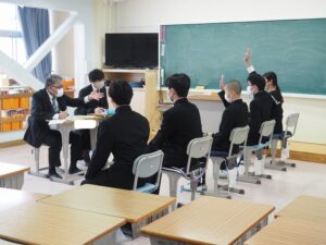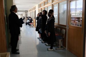 県外の高校に進学する生徒ですでに合格が決まった生徒がいますが、2月3日(火)4日(水)に私立高校入試があり、多くの生徒が受検をします。1月20日(火)22日(木)の2日間で、全職員に加え、退職された先生方、地域の方が面接官となり、面接練習を行いました。生徒は本番同様、緊張した面持ちで集団面接と個人面接に臨みました。一人ひとりに丁寧な指導をしてもらい、生徒はうなずきながら聞いていました。待ち時間には、面接ガイドを見て確認する姿がありました。アドバイスしてもらったことを参考にして、当日は自分らしく受け答えができるとよいと思います。