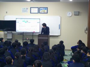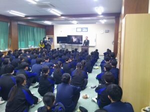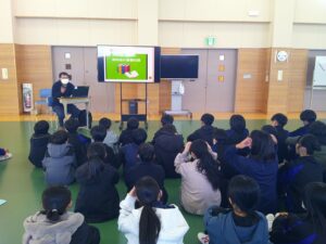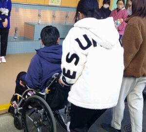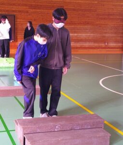 1月30日(金)、1年生は福祉体験学習を行いました。函南町社会福祉協議会の方の「福祉とは」についての講話を聞いた後、生徒はクラスごと4つの体験を行いました。視覚不自由体験では、目隠しをした状態で杖を頼りに障害物を避けたり、サポート役が半歩前を進み声をかけながら段差を乗り越えたりする体験をしました。車いす体験では、車いすで段差を上がる体験をしました。高齢者体験では、おもりをつけて手足を不自由にし、見えないメガネを装着して、階段を上り下りする体験をしました。認知症体験では、物忘れとは異なる記憶力と判断力が鈍る認知症の特徴や認知症の方への接し方について学びました。体験を通して、福祉を特別なものではなく、自分ができることは何かを考え、誰もが共生できる社会づくりに貢献していこうという気持ちを高めることができました。