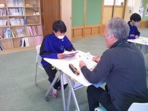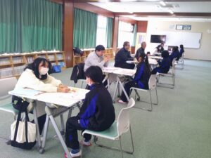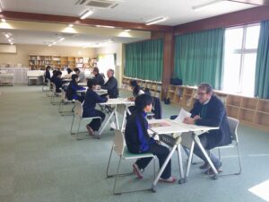 2月4日(水)1年生は、本校のALTの先生に加え、外部から派遣されたALT5名の先生方とパフォーマンステストを行いました。生徒は、ALTの先生と1対1になり、自己紹介をした後、指定された教科書のページのリーディングテストを行いました。その後、学校への登校方法や好きなレストランの名前、クラスの在籍人数についての質問に英語で答えました。最後に、絵の中の人が何をしているかを説明しました。これまでに学習した文法を駆使して、ALTの先生と英語で会話することができていました。今年度2回目ということもあり、会話が通じると笑顔になる生徒もいましたが、会話が続かず一問一答になったことで「もっと勉強をがんばりたい」と感じた生徒もいました。