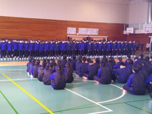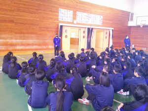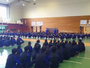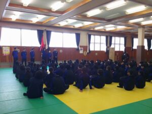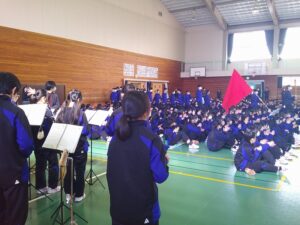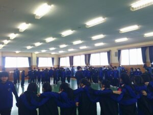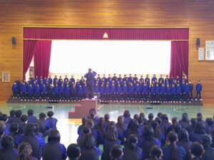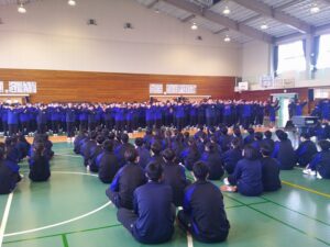 3月12日(木)3年生を送る会が行われました。1・2年生は、これまで朝や昼休み、帰りの会を使って歌やメッセージ、応援の練習をしてきました。その成果を発揮し、3年生に感謝の気持ちを伝えることができました。メッセージの中には、3年生の行事や部活動での思い出の場面だけでなく、集会時のお手本となる黙想の姿も語られました。3年生はその気持ちに応え、「さすが3年生」と感じられる男声の力強さと女声の響きのある迫力ある合唱をお返しとして歌ってくれました。「今日は温かく、思い出に残る時間をありがとうございます。自分たちもこれまで企画してきたからこそ準備の大変さがわかります。1・2年生にはこれから挑戦することを楽しんでください。壁にぶつかっても支えてくれる仲間や先生が函中にはいます。」という3年生からのメッセージも心に響くものでした。3年間の思い出のスライドでは、懐かしい写真に盛り上がりました。さらにお世話になった先生方からのビデオメッセージに聞き入っていました。心の温まる三送会でした。