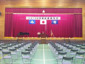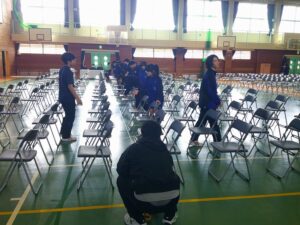 3月18日(水)卒業式の準備をしました。会場となるアリーナのいす並べだけでなく、3年生の教室を飾ったり、廊下等をきれいにしたりしました。どの生徒も時間いっぱい活動していました。明日の卒業式が楽しみです。