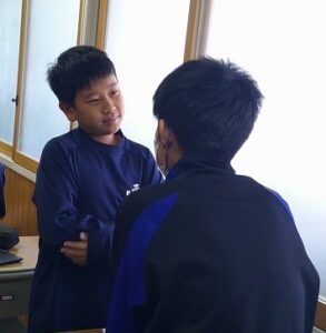 6回目のハートマッスルは、ノンバーバルコミュニケーションを行いました。まず、表情だけで、「喜び」「悲しみ」「不安」「怒り」といった8つの感情を次の人に伝えるゲームをやりました。表情だけで最後まで確実に伝わったチームはわずかでした。次に、ジェスチャーだけで伝えたところ、半分以上のチームが成功しました。感想には、「気持ちは言葉だけでは伝わらないので、表情やジャスチャーをつけて相手に気持ちを伝えたい。LINEなどでは相手の表情などがわからないので相手がどんな気持ちなのかよく考えていきたい。」とありました。