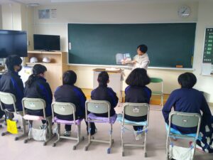 今年度6回目の読み聞かせがありました。校長先生の学校だよりの中に「書店の減少を肌で感じていらっしゃる方も多いのではないでしょうか。実際この10年間で全国の書店数はおよそ3割減少したという調査結果もあります。このような時代だからこそ、学校では子どもが本に触れる時間、活字を読む時間を大切にしています。ページをめくる音、紙の感触、インクの匂いといったアナログな感覚は、物語や知識の世界に深く入り込み、読書の世界に集中する助けとなります。自分のペースで文字を追い、行間を読み解く時間は、想像力を大きく育み、子どもたちの心に深い感動と豊かな教養を刻みます。まさに本を読むひとときは、デジタル画面では得がたい、予期せぬ発見と深い学びをもたらす貴重な時間でもあります。」とあります。今後も、函中では読み聞かせを通して、本に親しむ活動を続けていきます。
