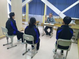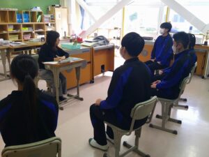 12月3日(水)1年生の英語の授業では、本校のALTの先生に加え、外部から派遣されたALT5名の先生方が来校し、パフォーマンステスト(話す力を測るテスト)を行いました。生徒は、ALTの先生と1対1になり、自己紹介をした後、自分が好きなもの(キャラクターや音楽など)を説明しました。そして、「スポーツはできる?」「ライスとパンどっちが好き?」「好きな歌手は?」といった質問に英語で答えました。最後にフリートークで生徒が質問をしました。中学生になってから初めて1対1で会話するとあって、最初は緊張し不安いっぱいだった生徒も、自分の英語が通じたり、英語を聞き取れたりしたことで笑顔で対話している生徒が多かったです。一方で、終わった直後に残念がっている生徒もおり、もっと英語を勉強してコミュニケーションをとりたいと、学習意欲が増している生徒もいました。