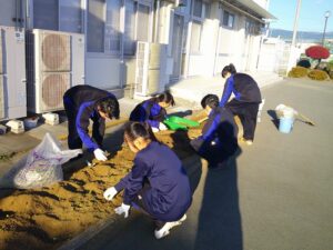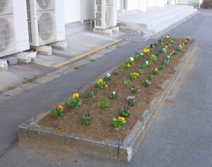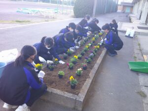 函南町には花苗等支給事業があり、年間2回パンジーやノースポール等の苗をいただいています。後期に発足した福祉委員会は、募金活動やアルミ缶回収活動に取り組んでいますが、12月11日(木)の放課後に、花苗を植える活動をしてくれました。昇降口や玄関前が華やかになりました。