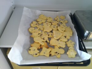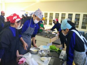 2年生は家庭科の授業で、クッキーづくりをしました。生地をこね、のばし、型を作り、オーブンで焼き、完成です。グループで協力しながら、楽しそうに作業していました。