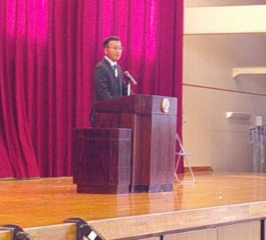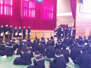 終業式は久しぶりに体育館に全校生徒が集まって行いました。代表生徒の言葉では、「時間の使い方を見直したことで勉強を頑張ることができた。3学期は現状に満足することなく2年生に向けてより一層努力を続けていきたい。」「部長として、みんなが楽しんで活動できるようメニューなどを考えた。自分に合った勉強法を見つけ、はっきりした目標を立てて努力すればその頑張りが結果として表れることがわかった。」「蒼龍祭の実行委員にチャレンジしたことで自分に自信がもてるようになった。学年目標の『感謝・自立・団結』の中でもみんなが自立できるようになれば、今までお世話になったまわりの人に感謝できるようになると思う。」と発表しました。校長先生の話では、今年の漢字の『熊』についてふれ、自然とどうつき合っていくかを考えなければならないという話、何かにチャレンジして失敗することが、次への意欲と挑戦につながり、自分をさらに成長できる、というお話がありました。