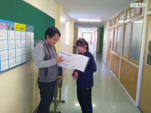 最後の学活では、担任の先生が一人ひとりに言葉をかけながら通知表を渡しました。明日から13日間の冬休みに入ります。