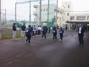 台風の目は、3人ひと組で棒を持ち、2つのコーンを回り、待っている人が棒をジャンプし、頭の上を通過して、次のグループに回す、という種目です。